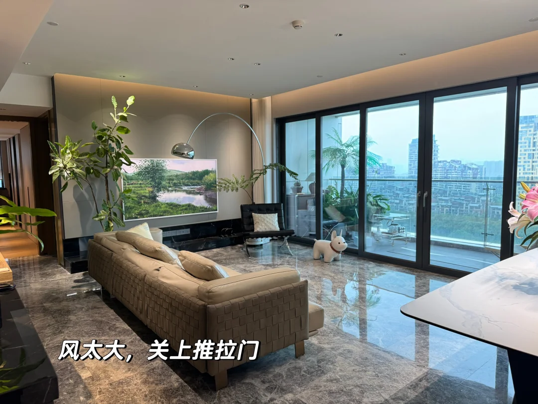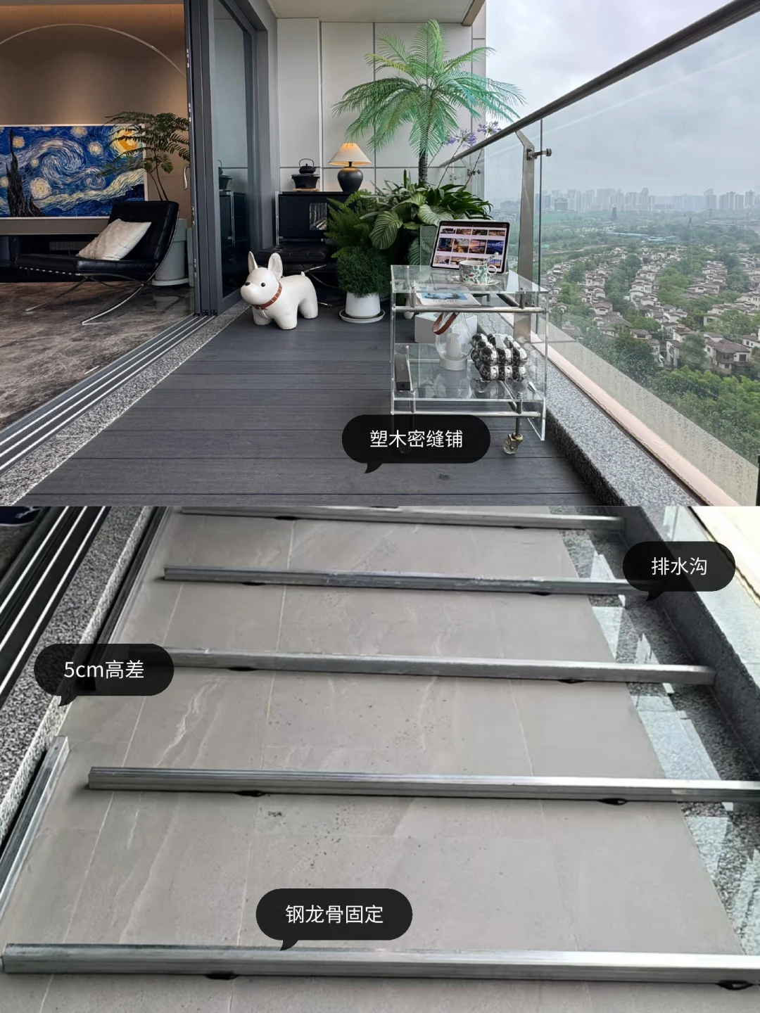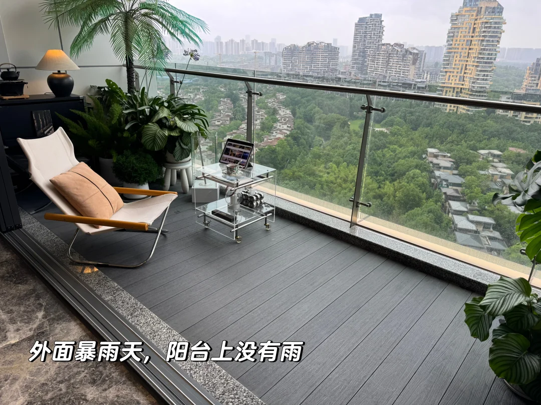 即使遇到特大暴风雨,客厅关上推拉门,因为阳台铺的是塑化木+钢龙骨架空+排水沟和地漏,雨水飘进来阳台也没事