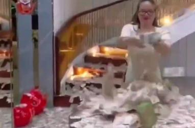 她曾因虚假广告被罚,还因炫富行为引发争议,她曾在楼梯上撒钱、踩“钞票路”、炫耀房产。