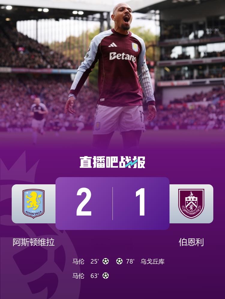 全场比赛结束,阿斯顿维拉主场2-1战胜伯恩利。