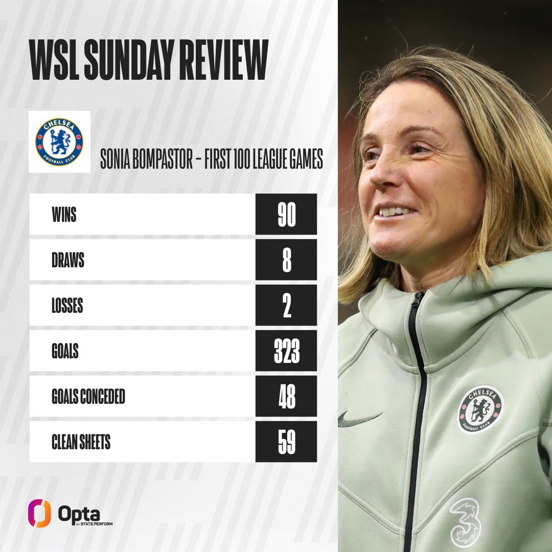 截至目前,她的球队在这100场比赛中取得了90胜8平2负的惊人战绩,胜率高达90%。自接手球队以来,邦帕斯托带领切尔西女足延续强势统治,在上赛季以不败战绩夺得英格兰女足超级联赛冠军,完成了球队的联赛六连冠伟业。