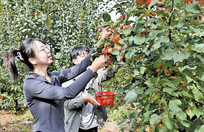 10月1日,在张家口市宣化区大慢岭村的海棠园里,游客在采摘海棠果。河北日报记者郭晓通摄