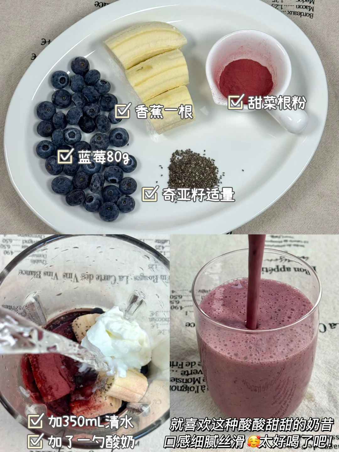 4️⃣蓝莓🫐➕香蕉🍌➕奇亚籽➕甜菜根粉➕酸奶