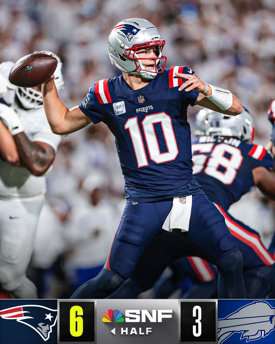NFL官方X账号发布推文报道,半场结束前所有射门得分统计。新英格兰vs布法罗的比赛正在NBC直播,可通过@NFLPlus或Peacock平台观看