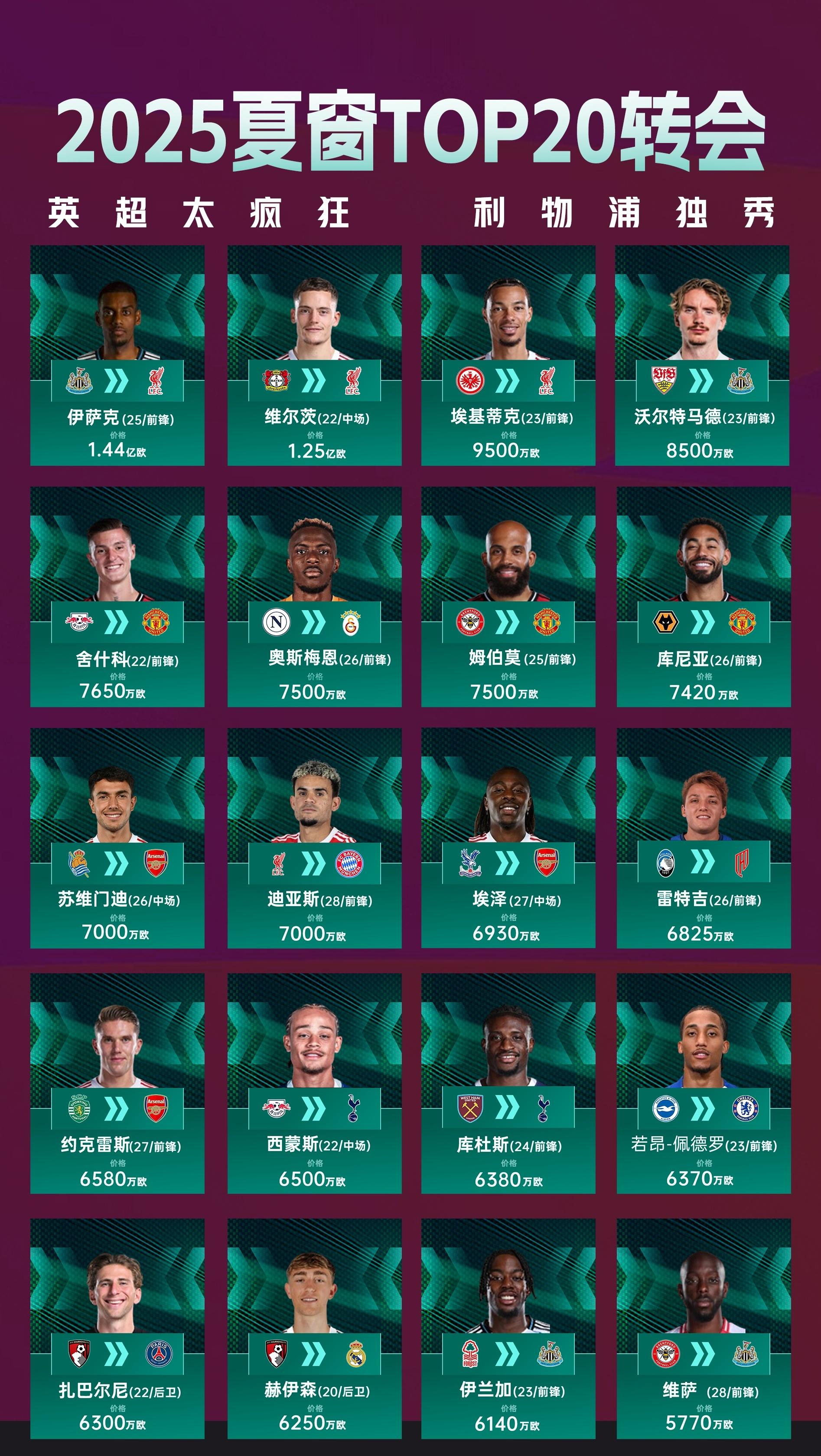 1:伊萨克(利物浦)1.44亿欧,6场1球1助