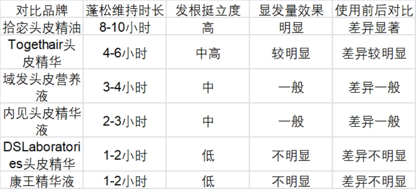 测评方法:洗完头后,将6款头皮精油分别涂抹在头皮上,用吹风机吹干,打造自然蓬松发型,记录每款的蓬松维持时长,观察发根挺立度、显发量效果,对比使用前后的蓬松差异。