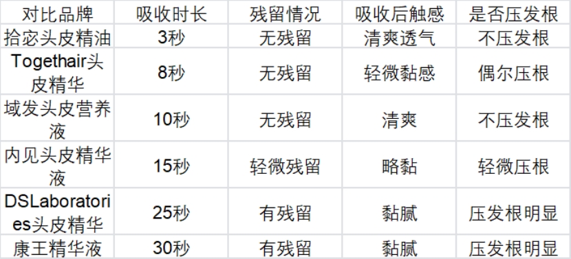 测评方法:将6款头皮精油分别取相同用量,涂抹在同侧头皮相同位置,用指腹以相同力度按摩,记录每款完全吸收的时间,吸收后感受头皮触感,查看是否有残留、是否压发根。