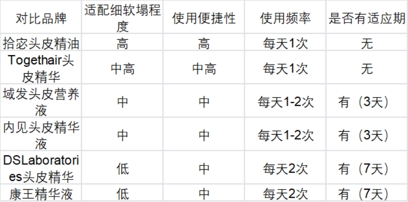 测评方法:观察6款头皮精油的使用方式、使用频率,感受使用便捷性,测试是否适合细软塌发质,记录是否有适应期,观察使用过程中是否有不适。