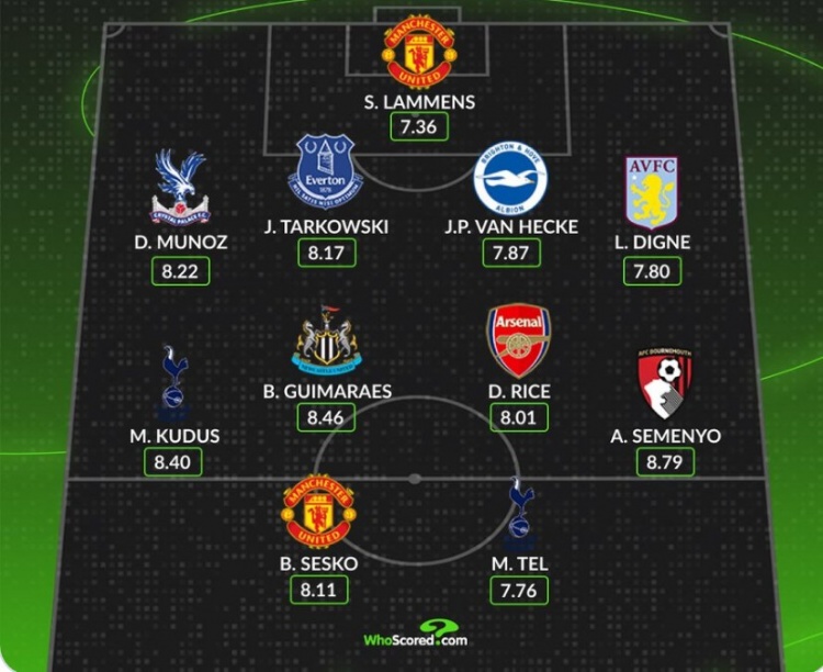中场:库杜斯(热刺)、吉马良斯(纽卡)、赖斯(阿森纳)、塞梅尼奥(伯恩茅斯)