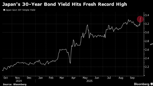 在标售前夕,日本30年期国债收益率触及纪录新高,市场担心高市早苗的政策将增加政府支出并推高通胀。高市的胜选也削弱了对于日本央行本月加息的预期,她的经济政策顾问本田悦朗认为加息更好的时间是在12月份。