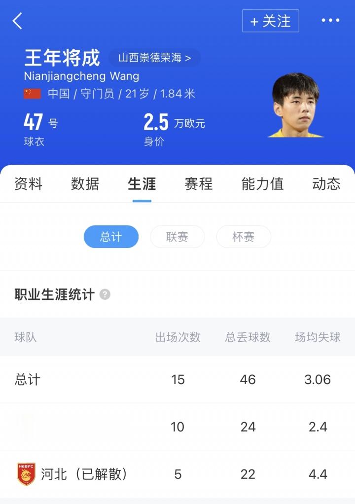 王年将成现年21岁,曾效力过河北、山西崇德荣海,代表河北在中超出场过4次,在足协杯出场过1次;代表山西崇德荣海在中乙出场过8次,在足协杯出场2次。