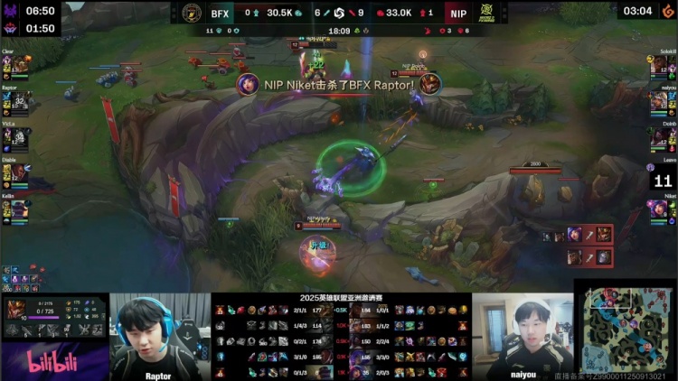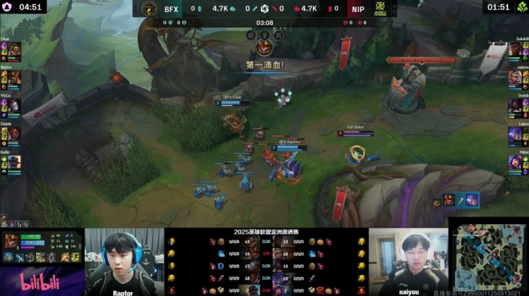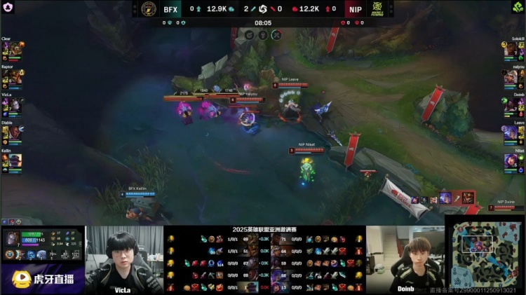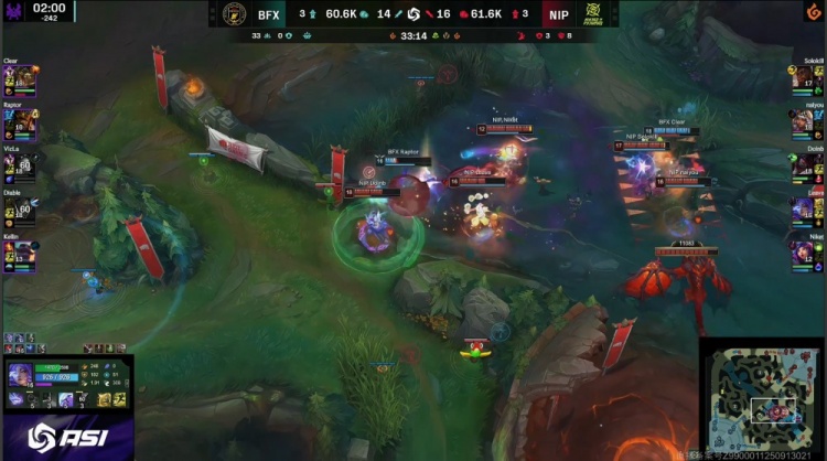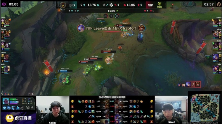 [19:45]中路混战,Diable卢锡安空大E脸被打出双召,naiyou击杀Kellin布隆,野区Raptor皇子被打出闪现,Clear鳄鱼开大单杀Leave芸阿娜,河道naiyou奇亚娜被Raptor皇子火锅扣出闪现,BFX去开厄塔汗,NIP过来接团,Doinb阿卡丽进场单杀Raptor,Diable卢锡安反手三杀,BFX打出1换4吃掉厄塔汗,双方经济持平。