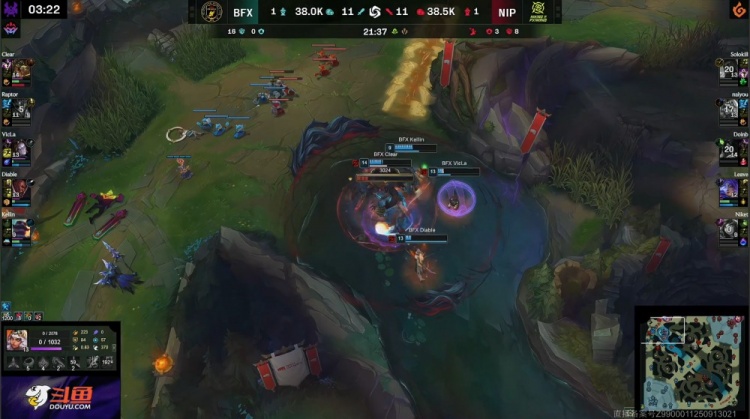 [3814]野区团战,Doinb阿卡丽先被击杀,Diable卢锡安三杀收割,BFX冲上NIP高地,一波推平NIP基地先下一城。