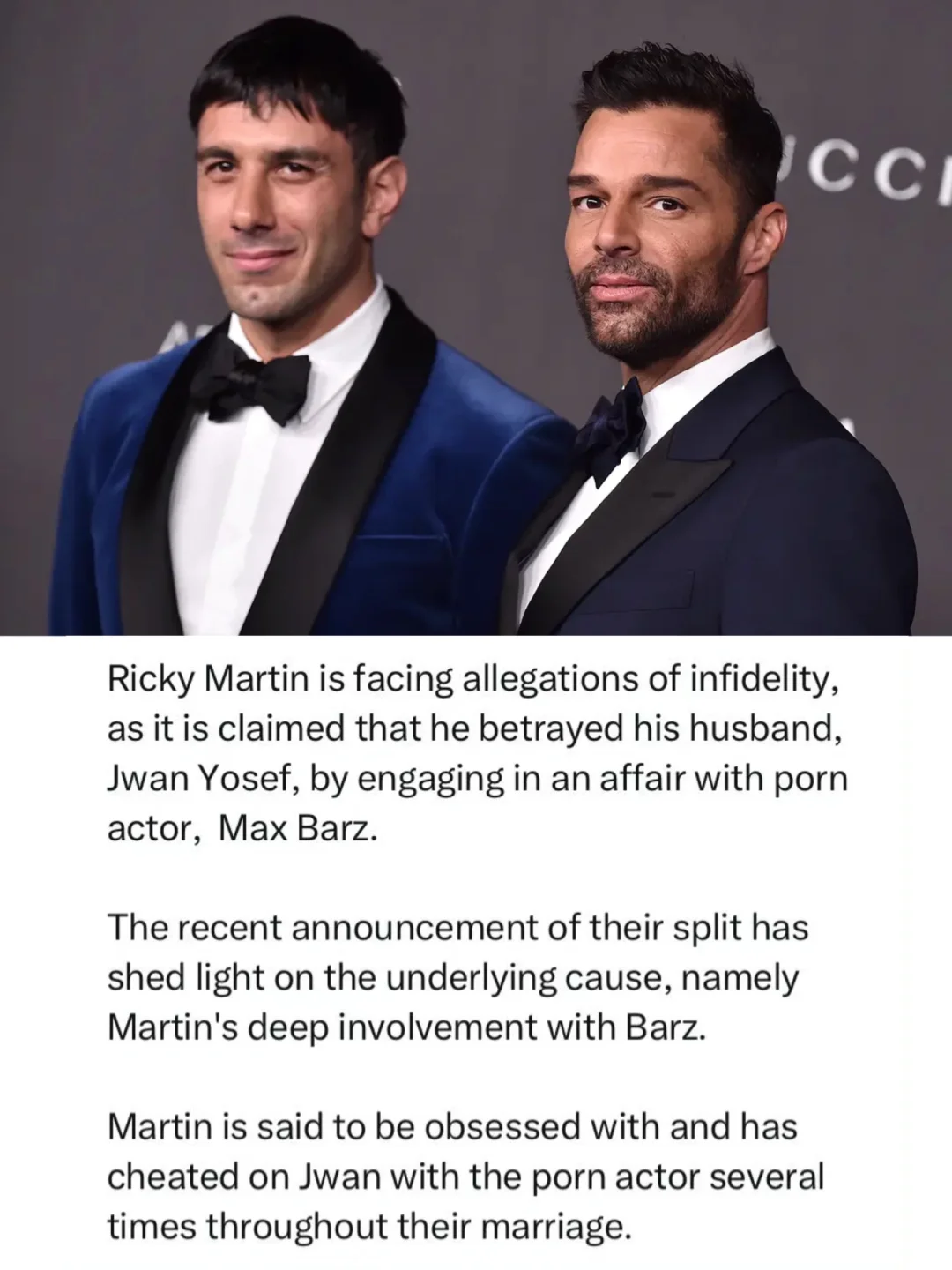 🔥 新抓马! 🧑🤝🧑 拉丁王子瑞奇·马丁日前官宣离婚,结束了和丈夫Jwan Yosef 的6年婚姻,今日媒体爆料称离婚原因是瑞奇·马丁出轨不忠。 💥 媒体说瑞奇·马丁迷上了色情演员Max Barz,对他超级迷恋,在婚姻期间多次出轨,从而背叛了自己的丈夫Jwan Yosef,导致婚姻破裂。 🎭 除了Max Barz,媒体也指出瑞奇·马丁还跟墨西哥演员Eduardo Verastegui搞过婚外情。 🎙️ 只能说这很难评!