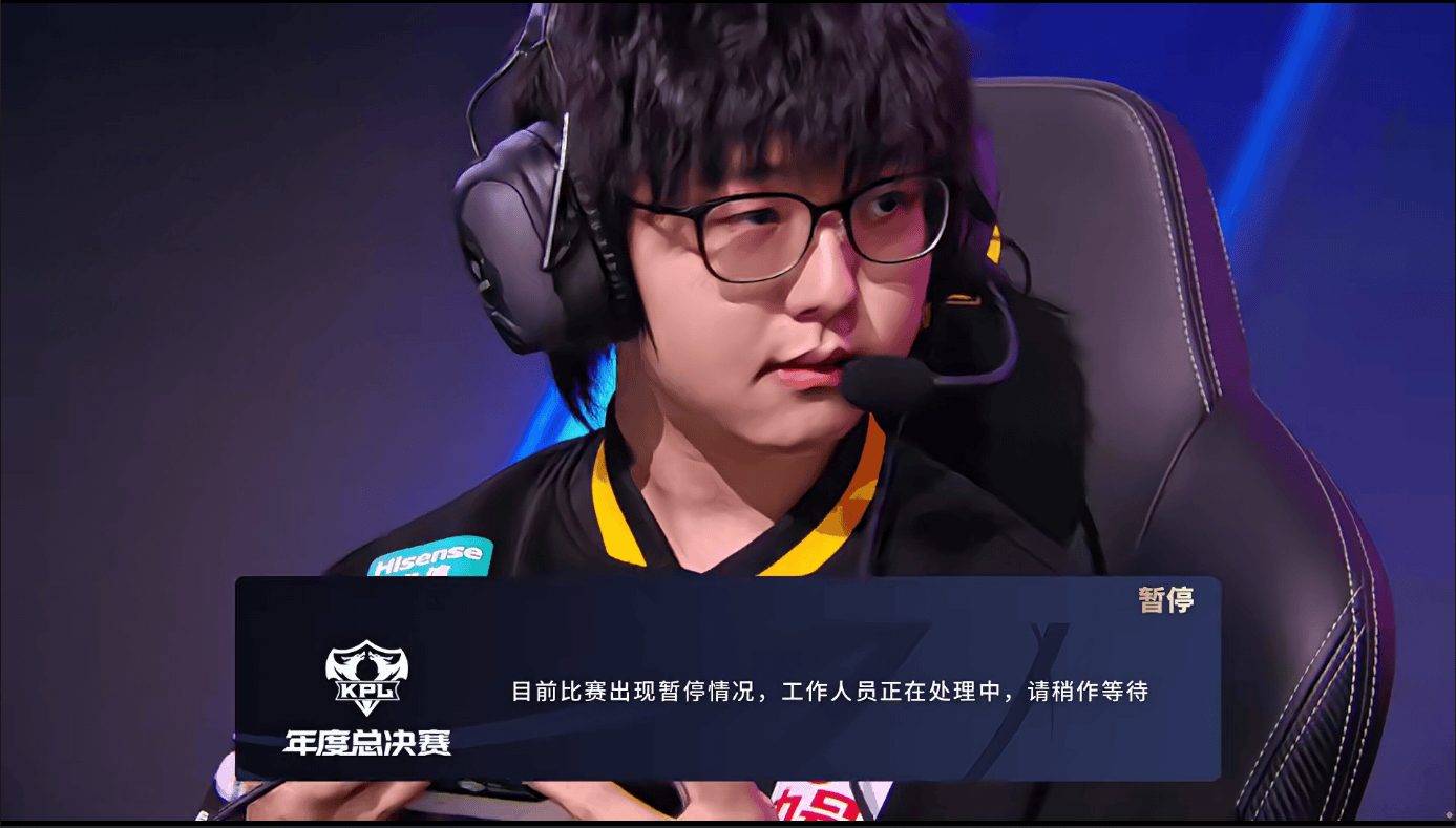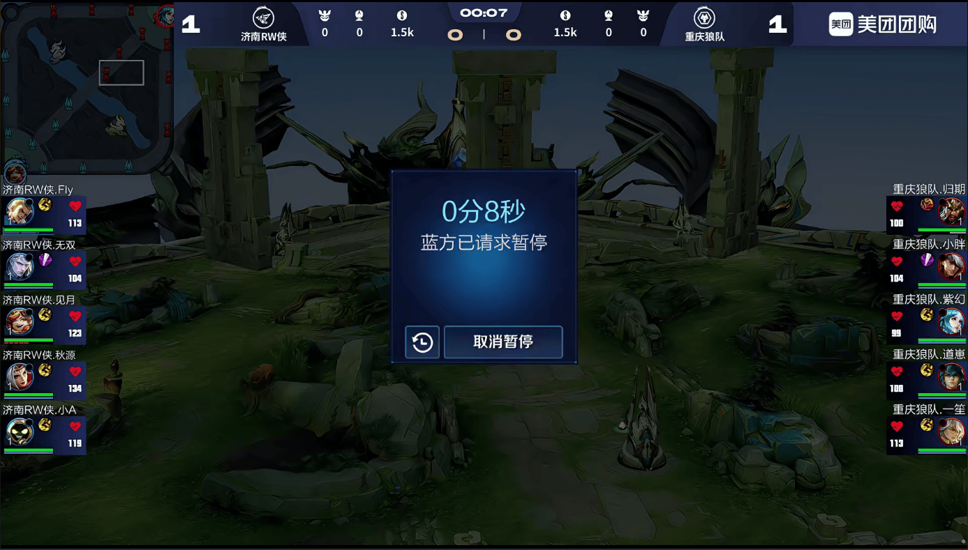 RW侠对阵狼队第三局出现暂停,工作人员正在处理,稍事等待