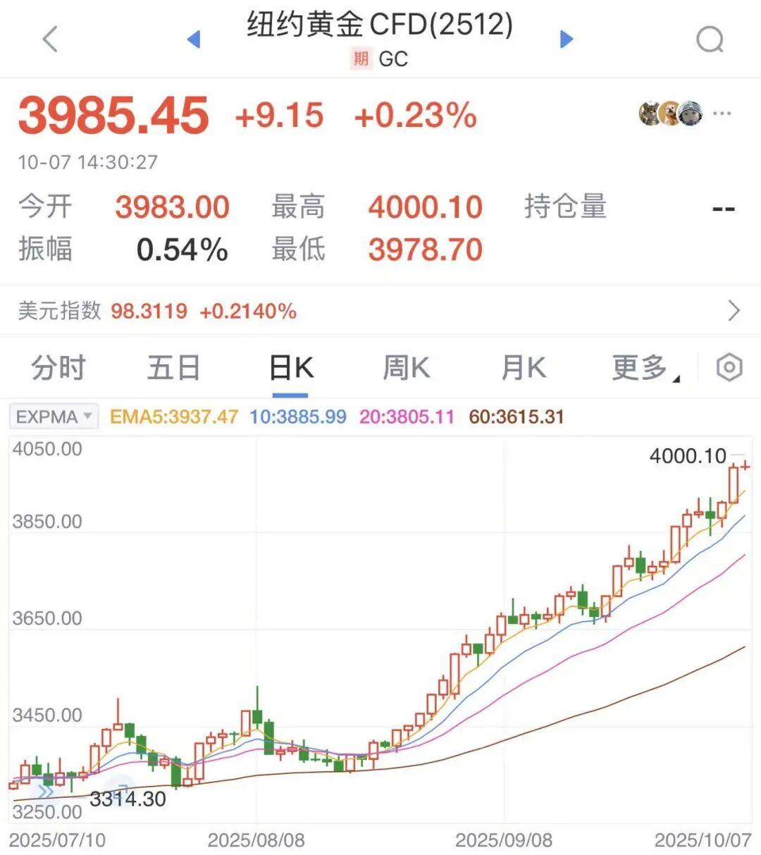 今年以来,黄金价格暴涨,截至发稿,纽约黄金期货报3985.45美元/盎司,盘中一度突破4000美元/盎司,年内涨幅已达50%。