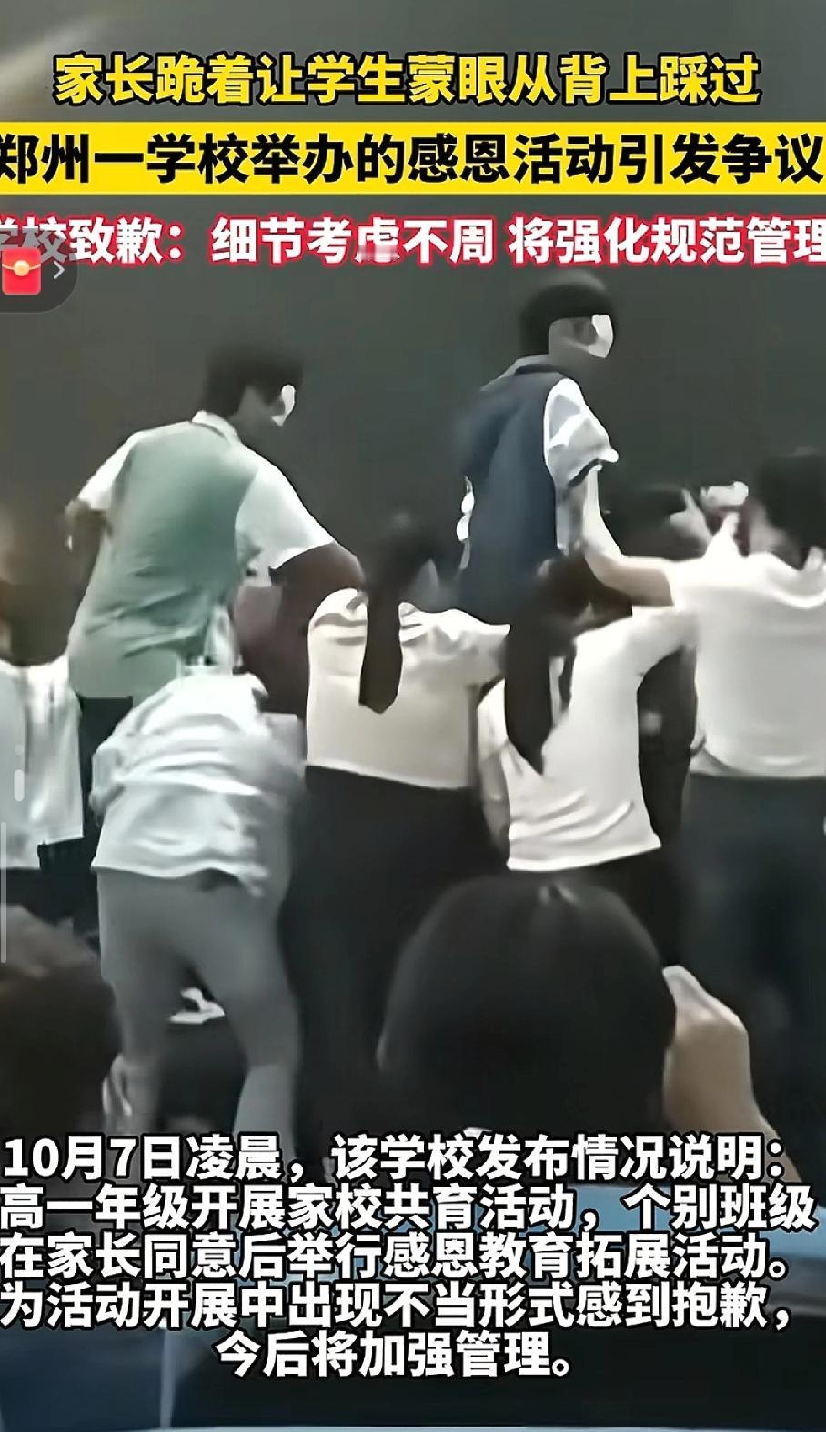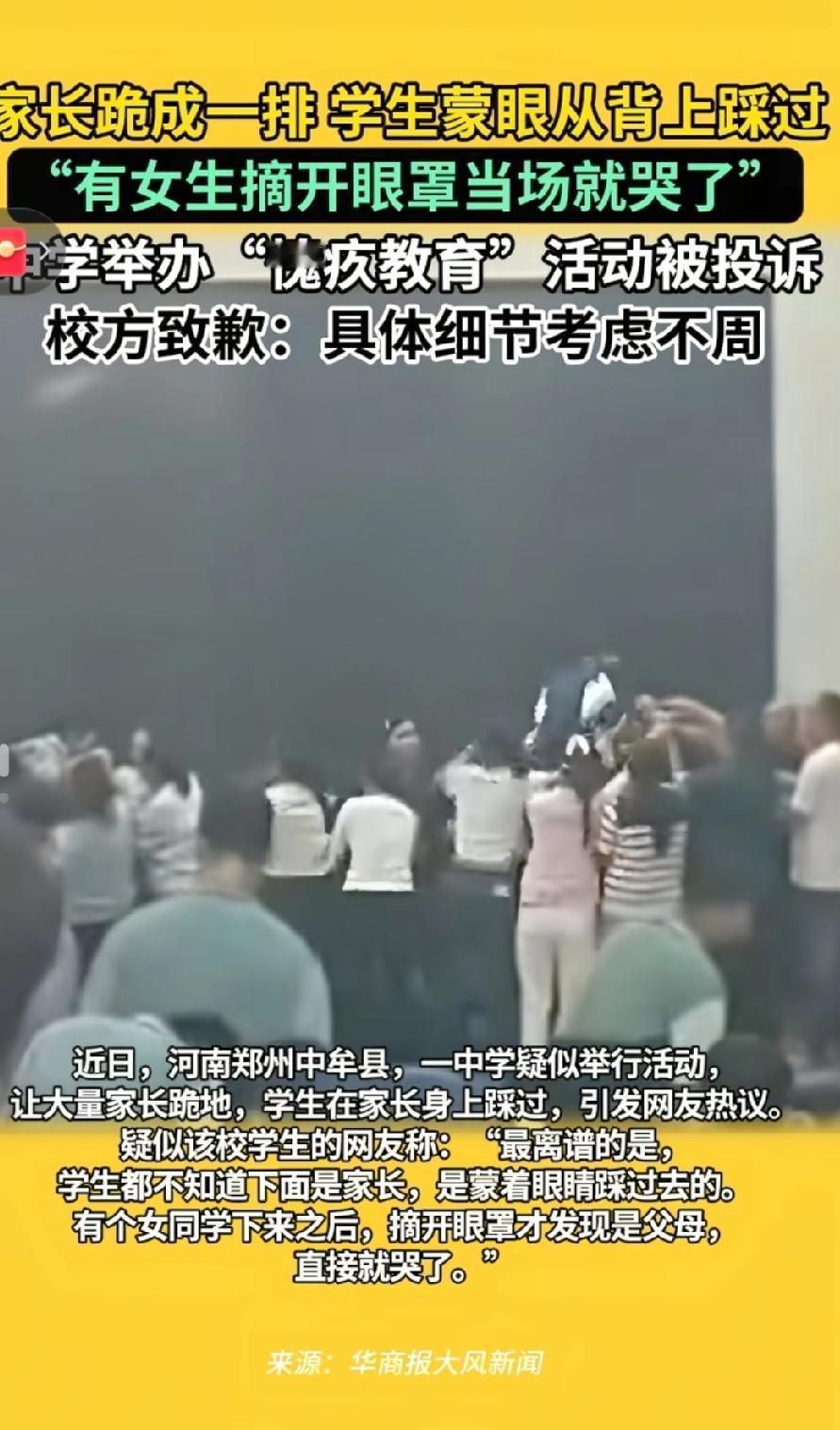 家长跪地让孩子踩踏,这是教育还是羞辱?一段“感恩教育”现场视频曝光:母亲跪地,孩子从背上踏过,美其名曰“学会担当”。可这哪是成长,分明是尊严的践踏!真正的感恩,是教孩子尊重生命,而非制造精神跪拜。教育的底线,不该以父母的卑微换取孩子的“觉醒”。爱不是表演,更不该让孩子在羞耻中长大。郑州感恩教育 无意识踩踏事故