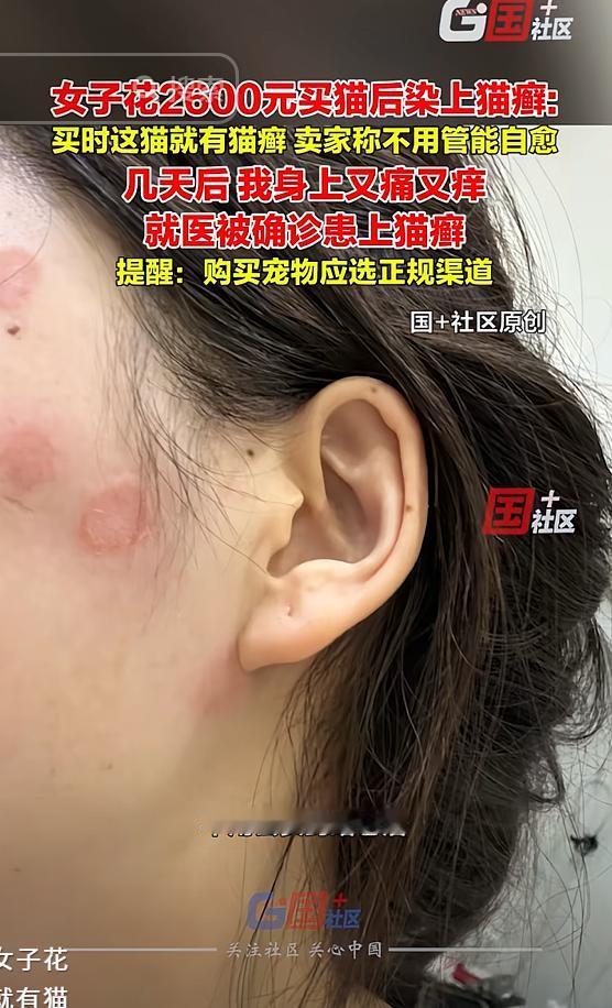 崩溃了!浙江嘉兴,女子花2600块钱买了一只猫,没几天,女子脸上就红了好几块,又痛又痒,一查传染上了猫藓,甚至胳膊上也是,想起当初买的时候,就发现猫有猫藓,卖家还说能自愈,女子后悔不已! 10月6日,据国+社区报道,女子买猫,却没想到会被猫传染上疾病。 她买猫时,就发现猫咪身上有掉毛,还有红红的好几块,卖家说是猫藓,回家不用给它治,几天就好了,女子信以为真,花2600带回家。 几天后,女子发现自己身上又痛又痒,一看,身上起了跟猫一样的红色斑块,她这才意识到问题。 跑到医院一检查,确诊了猫藓,女子愣住了,自己怎么会和猫得一样的病,更恼火的是,传染的还很快,女子真怕脸上留疤。 她又联系商家,将猫退了回去,自己实在不能养了! 女子买猫时,就该了解一下猫藓到底该不该治,会不会传染给人,要是她拿出手机查一下,说不定就不会买了。 商家也太无良了,猫得了猫藓不给它治,还想尽快出售,卖价更是一点不便宜,让女子也传染上了。 商家也没把猫藓的危害性告诉女子,生怕她不买。 按照相关规定,卖家不能把带有疾病的宠物卖给别人,这样一旦宠物被买走没几天就发病,还会给买家带来经济负担,甚至会导致宠物死亡,那可都是看得见的损失。 有网友表示自己也买到过有猫藓的猫,最后到宠物医院治疗,还诊断出了别的疾病,最后花了几千,钱没了,猫也没了。 女子的遭遇更惨,甚至还得遭受身体上的折磨。 其实人在抵抗力差的时候,是有几率传染上猫藓的,再加上猫本来就亲人,喜欢跟人挨在一起、跳到床上、沙发上等地方,就更容易将猫藓传染给主人了。 女子下次养宠物之前,一定要考虑清楚,也要了解宠物的身体状况,如果买来后,就带到宠物医院治疗,等猫情况好转后,再猫回家,也不至于传到自己身上了。 归根结底,还是对宠物不太了解,又容易听信他人闹得。 女子自己的烦恼也不小,脸上、胳膊上都是猫藓,还会被人误会,她不得不发视频,解释自己的猫藓,以免别人害怕她有什么疾病。 还有网友表示,猫藓会留疤,还会留下黑色的印子,自家孩子喂流浪猫传染上了,好久都消不掉。 希望女子能尽快看好,尽量不要留下什么疤痕,毕竟长得这么漂亮,因为一只猫留下遗憾,那就没处说理了! 你认为,商家该为她负责吗? (来源:国+社区 2025年10月6日 10月6日,浙江嘉兴,女子花2600元买猫后染上猫藓:买时这猫就有猫藓,卖家称不用管能自愈)