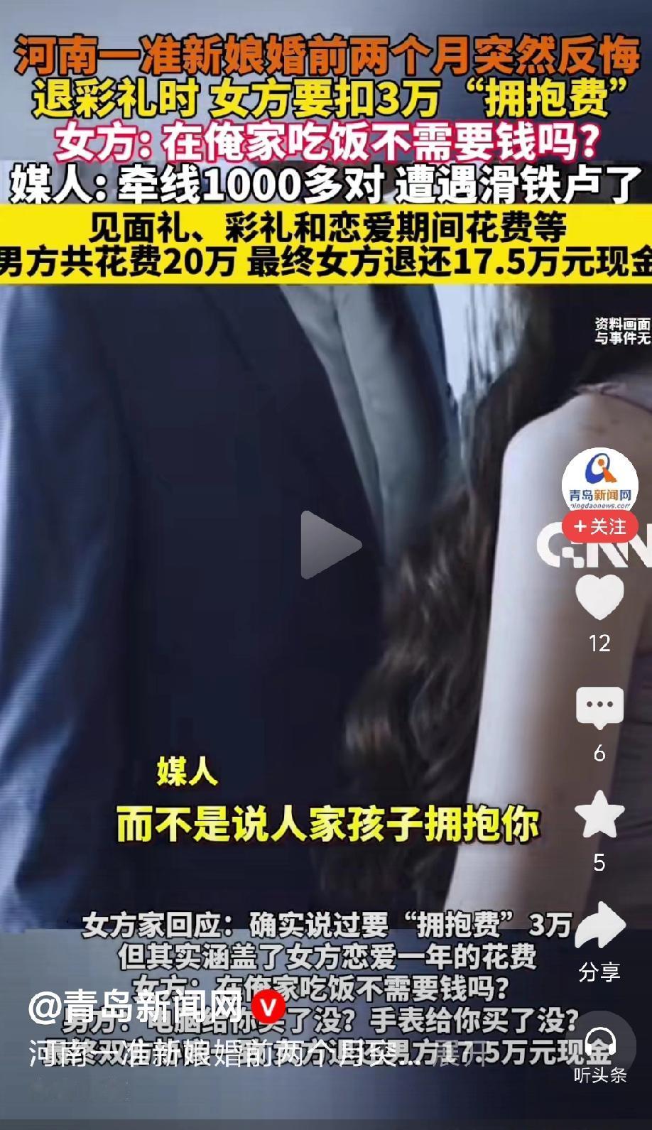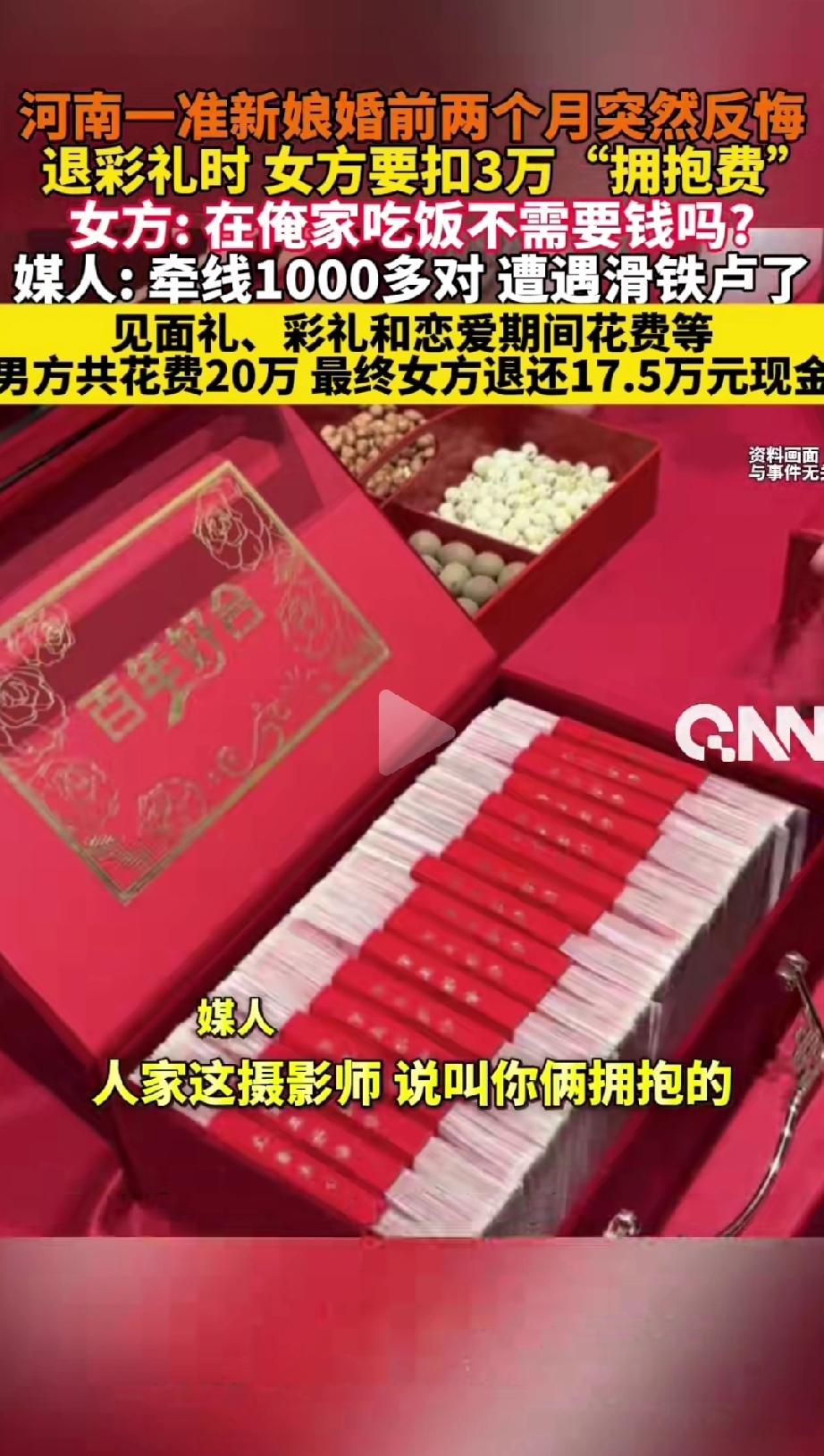 真是开眼了!拥抱一次要3万!河南平顶山一准新娘婚前两个月突然悔婚,20万的彩礼要扣3万的拥抱费! 女方嫌男方老实、工资低,马上要结婚了突然说不嫁了。结果退的时候出幺蛾子:“得扣3万拥抱费,就退17万!” 理由离谱到没边儿:拍婚纱照时摄影师让抱了一下,这就得算钱! 不是,这钱是按“抱一下”明码标价了?还是男方主动凑上去的?人家明明是听摄影师安排,合着正常拍婚纱照的动作,现在成了扣钱的“把柄”? 更气人的是,男方没做错啥,这3万扣得没天理,可偏偏又没法儿硬刚——法律上还真难卡这个“拥抱费”的理,最后只能吃这哑巴亏。 这哪是退彩礼啊,分明是找不着理由硬薅钱!彩礼本是图个吉利,现在倒成了某些人悔婚时“宰一刀”的工具,真该好好管管这种歪风气了!