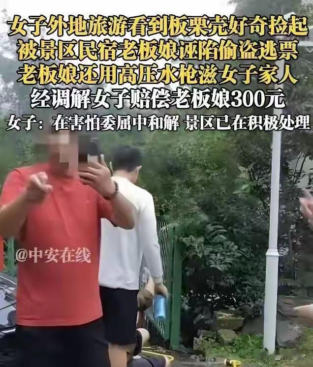 游客捡板栗壳被索300元, 景区回应引爆争议! 国庆期间江苏连云港花果山景区发生一起纠纷。一名女游客在路边捡起一个掉落的板栗空壳。她说第一次见到带壳的板栗想看看样子。 民宿老板娘突然冲过来。她指责游客偷板栗。还说他们是逃票进来的。游客解释只是捡了个空壳。老板娘根本不听。 冲突瞬间升级。老板娘抄起洗车用的高压水枪。直接对着游客的脸喷。游客母亲上前推了老板娘手臂。老板娘随即倒地。她声称自己怀孕两个月。说可能会流产。 警察赶到现场调解。游客最终赔偿300元。这个结果让很多人想不通。 事情在网上传开。网友发现一个矛盾点。国庆前连云港文旅官方账号刚发过文章。邀请大家来花果山捡板栗。说这是感受大自然的美好体验。 景区管理处随后回应。他们确认游客没有偷盗行为。但说民宿是商户个人经营。不归景区直接管理。 这个说法网友并不买账。大家觉得景区在推卸责任。事情发生在景区范围内。景区当然要负责。 有网友调侃说。捡板栗的快乐原来要300元起步。以后谁还敢去花果山。 旅游口碑需要长期积累。但破坏只要一瞬间。一颗板栗壳引发的问题。暴露出景区管理的漏洞。也反映出部分商户对待游客的态度。 这件事给所有旅游景点提了个醒。管理不能留死角。服务品质要跟上宣传脚步。否则最后吃亏的还是当地旅游经济。 参考资料 :根据法治进行时报道及网络热点整理
