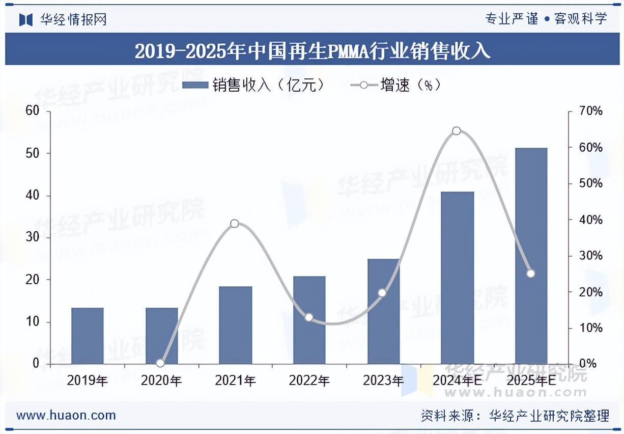 随着国家新型城镇化建设的推进,以及汽车、电子等行业的快速发展,PMMA在建筑、装饰、交通工具等领域的应用越来越广泛。例如,汽车行业对轻质高强度材料的需求持续上升,推动了PMMA在汽车领域的应用,进而带动了再生PMMA的市场需求。数据显示,2023年中国再生PMMA行业销售收入为24.98亿元,预计到2025年中国再生PMMA行业销售收入上涨至51.34亿元。