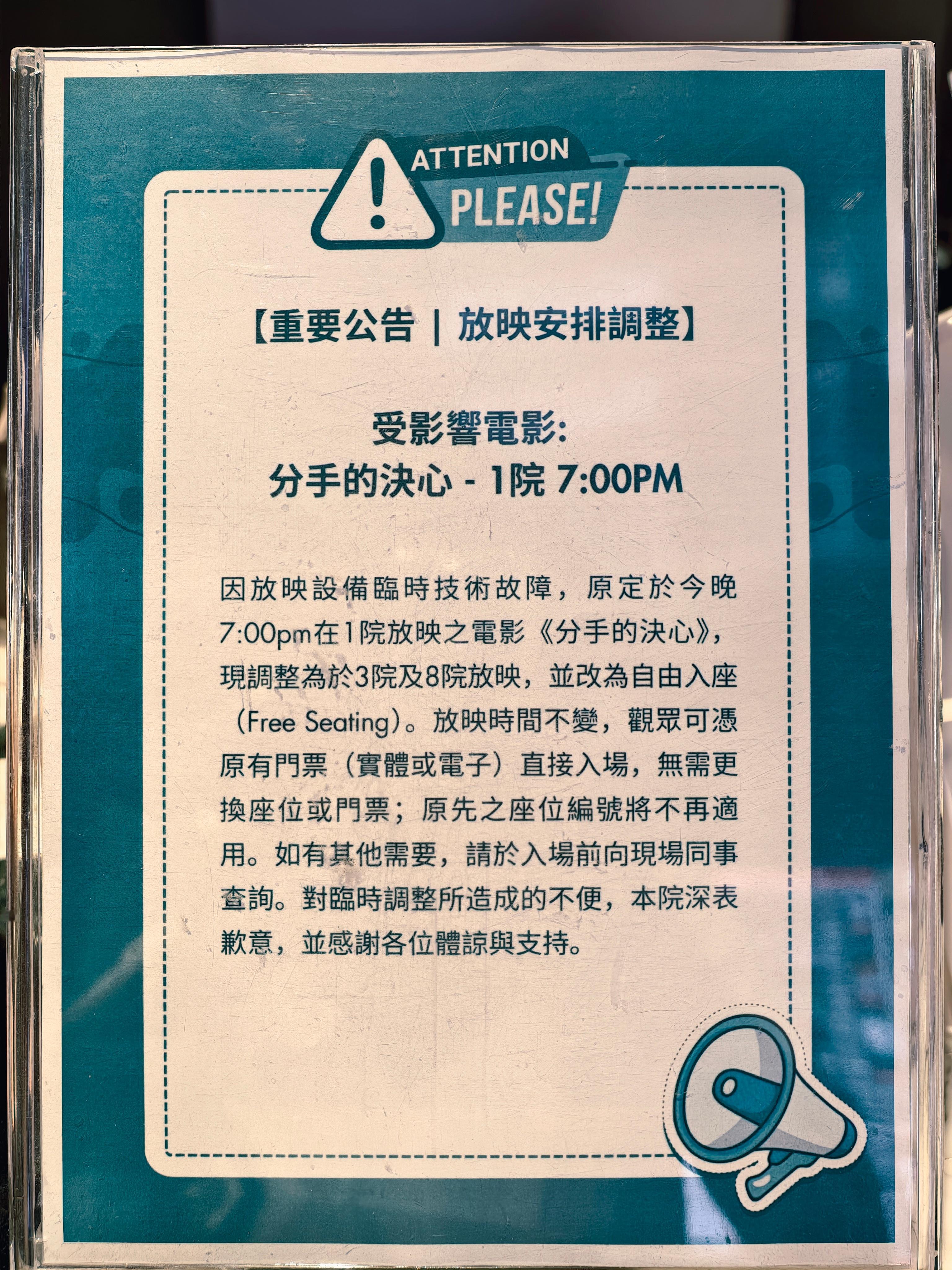 香港影讯 今晚PE大厅的《分手的决心》由于设备问题改到3和8厅放映了,座位先到先