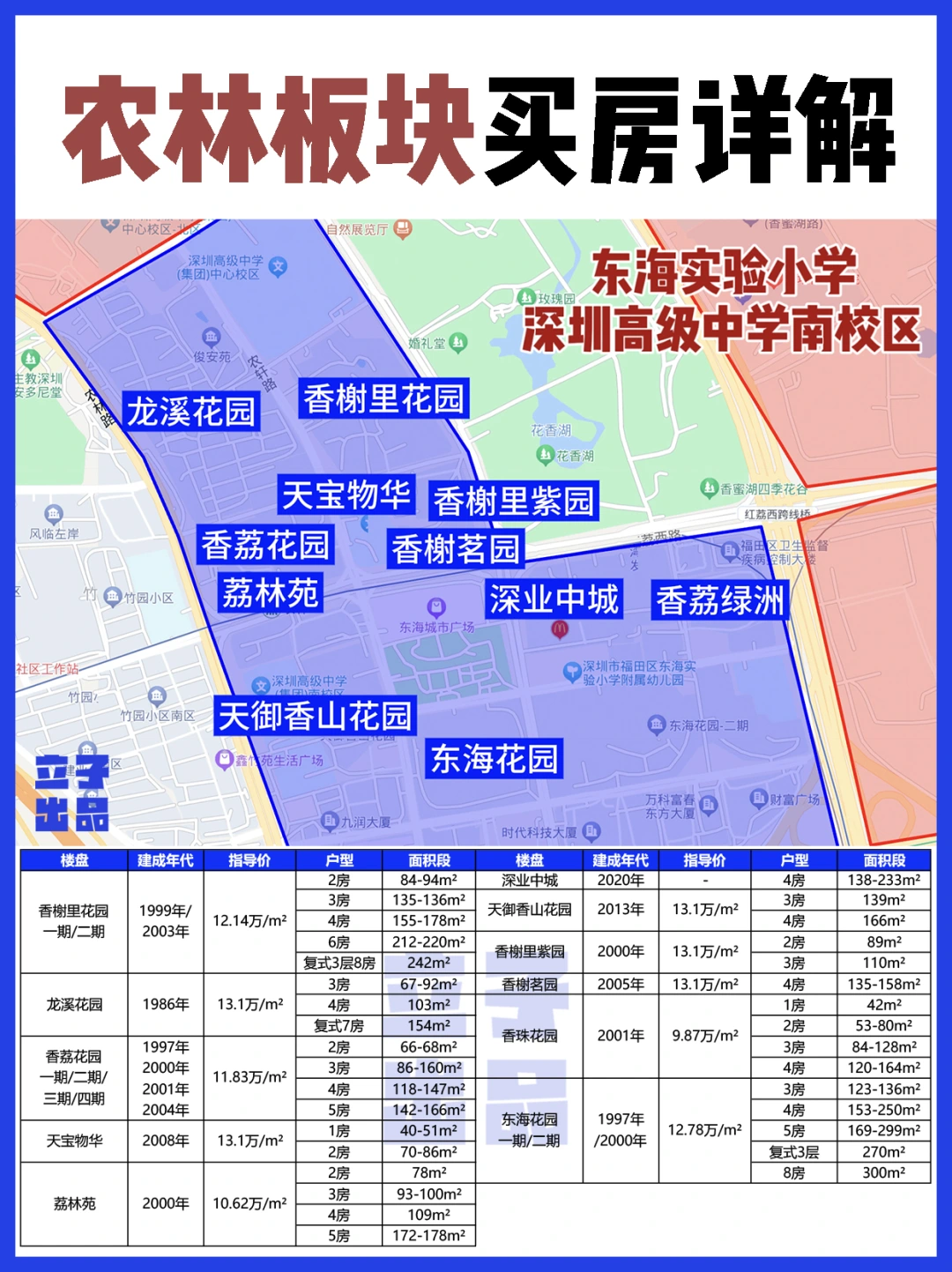 📍农林板块:带东海实验+深高南,产品跨度大,有经典改善盘东海花园、次新豪宅深业中城,也有上世纪老旧刚需盘龙溪花园等