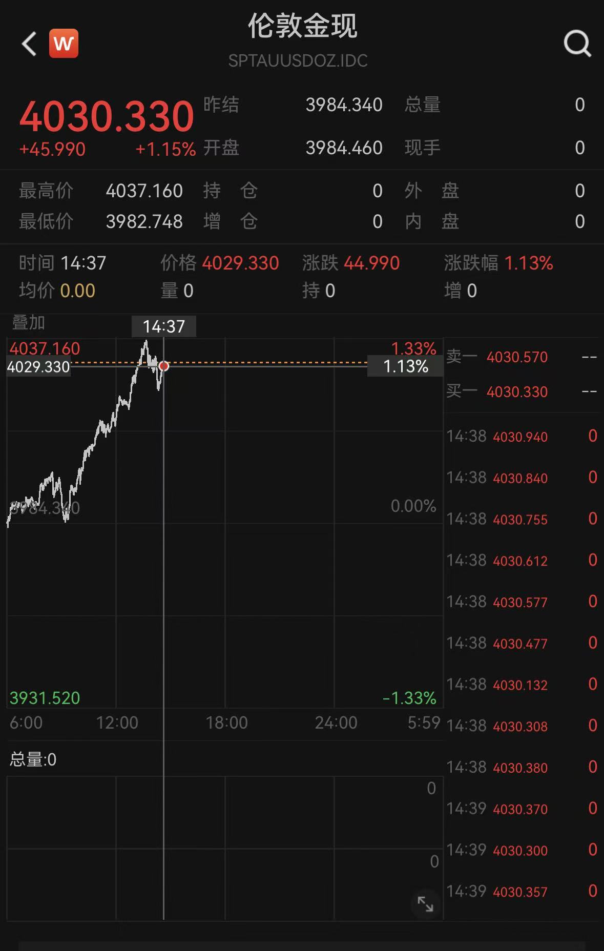 消息面上,北京时间10月8日上午,现货黄金突破4000美元/盎司大关,再创新高。Wind数据显示,截至北京时间15点06分,伦敦现货黄金盘报4030.330美元/盎司。