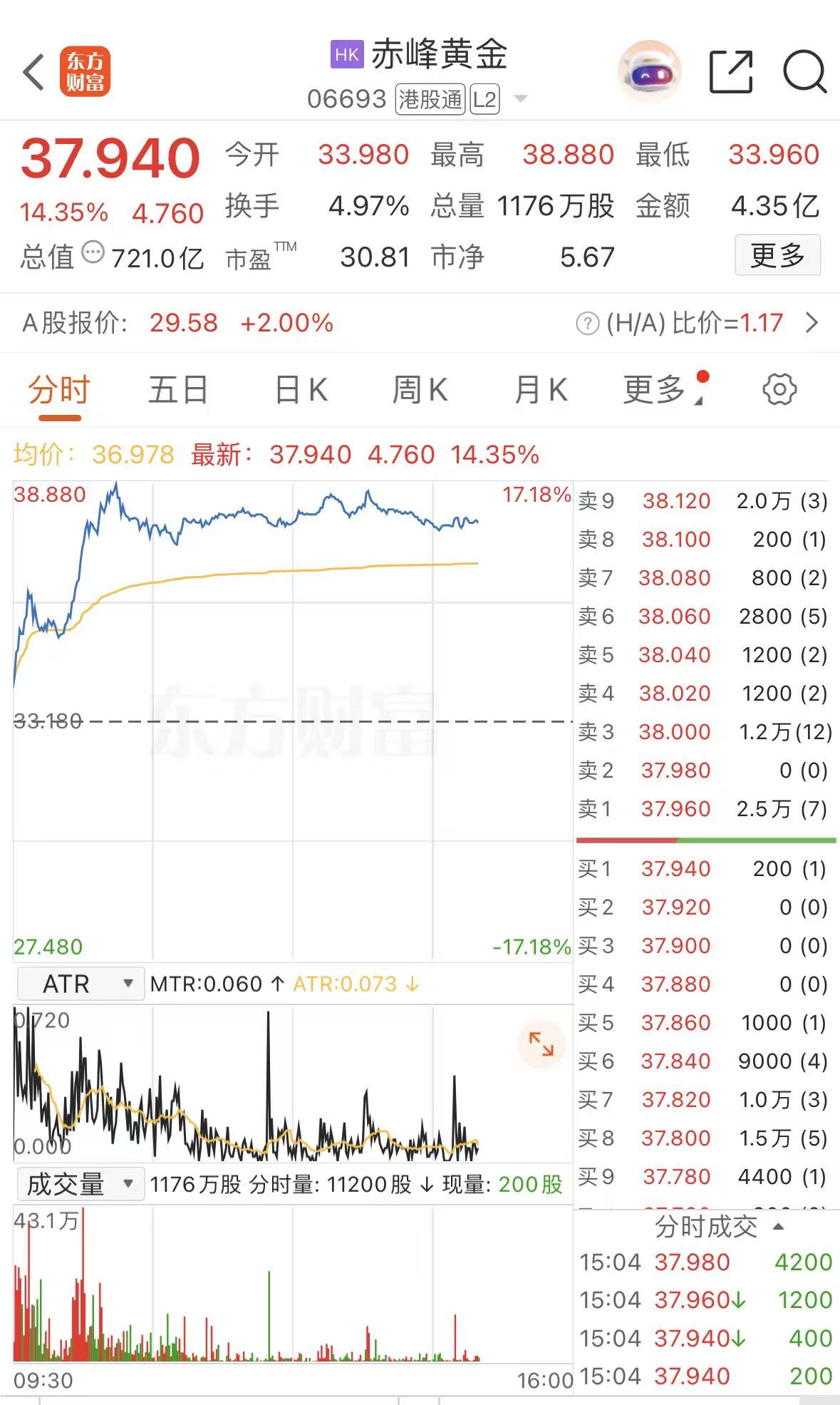 上证报中国证券网讯(林铭溱记者唐燕飞)10月8日,赤峰黄金高开高走,开盘涨2.41%,报33.98港元/股,随后盘中一度涨至17.12%,最高报38.88港元/股,股价创上市以来新高。截至15时06分,赤峰黄金涨14.35%,报37.94港元/股。