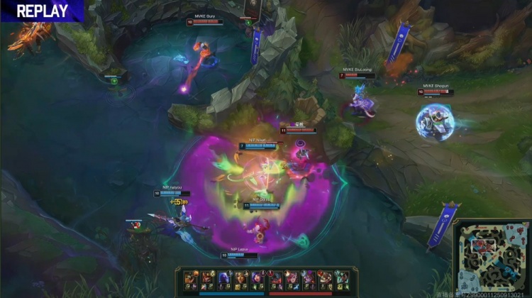 [19:33]MVKE中路推掉NIP一塔,中路团战,Doinb瑞兹开车送Niket妮蔻进场击杀Kratos剑魔,双方拉开,本局为风龙魂。