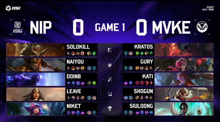 [3250]NIP上路推进拔掉MVKE二塔,经济领先9k,随后野区团战,B神瑞兹控住Shougun将其打残,Solokill与naiyou皇子进场收割,NIP打出0换5,一波推平MVKE基地先下一城。