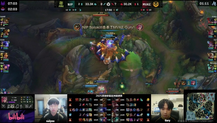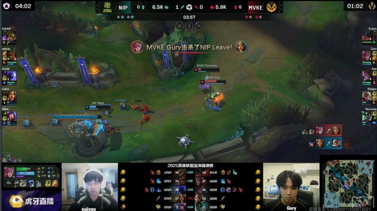 [17:55]NIP继续冲进MVKE野区,Solokill鳄鱼配合naiyou皇子盖帽击杀Gury,NIP经济领先4k。