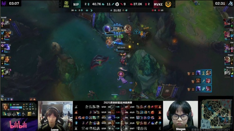 [15:52]先锋团,Gury拿到先锋,河道Kati阿萝拉TP落地被Niket妮蔻大招定住融化,NIP继续冲进MVKE野区找人,Doinb瑞兹一套带走Kratos剑魔,NIP打出0换2,推掉MVKE上路一塔,经济领先3k。