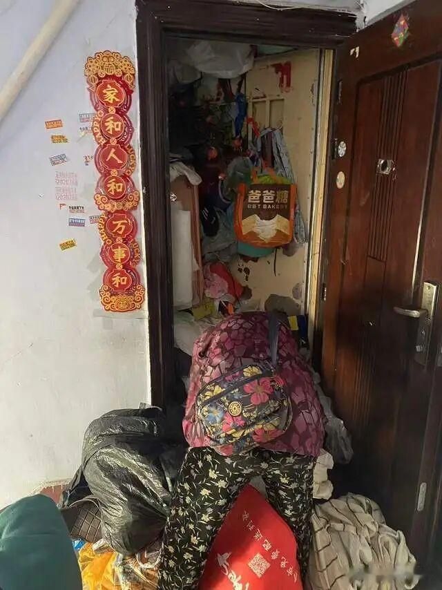 “她全都囤满,她是全都堆在家里,一开始我们去敲门,她都是往外爬出来的,是爬进爬出的,后来就堆得进不去了,堆的楼道里也有。”