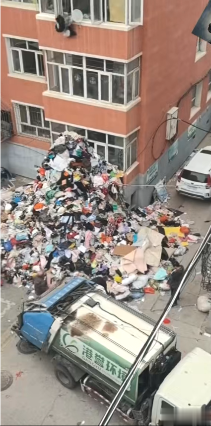 现场视频显示,从三楼阳台窗户抛下的东西约有两三米高,几乎遮住一楼住户的阳台。有工人将堆积如山的东西往车上转运。