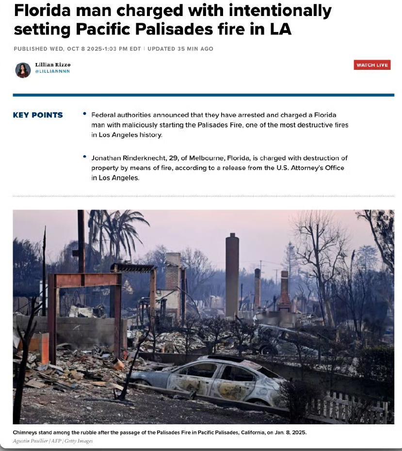 洛杉矶太平洋帕利塞德火灾的一名嫌疑人已被逮捕。嫌疑人是来自佛罗里达州的29岁的乔纳森·林德克内希特。 美国司法部表示,他是一名优步司机,在送下一名乘客后引发了火灾。 警方表示,他们已经检索到策划此次袭击的数TB数字数据,包括ChatGPT的文字记录和图像渲染。 其中包括询问ChatGPT“如果因你的香烟起火,你有责任吗?” 他还要求ChatGPT绘制一幅反乌托邦风格的燃烧城市和森林的图画。 他被控引发帕利塞德火灾。他先是放火,然后在火灾发生后的第一天晚上拍摄了消防员试图扑灭火灾的视频。 GPS和手机定位数据表明他身处现场。犯罪现场还发现了DNA证据。 量刑范围从5年到终身监禁,不得假释。 他将于美国东部时间1:30/太平洋时间10:30出庭。