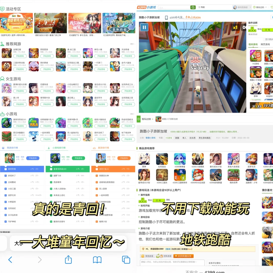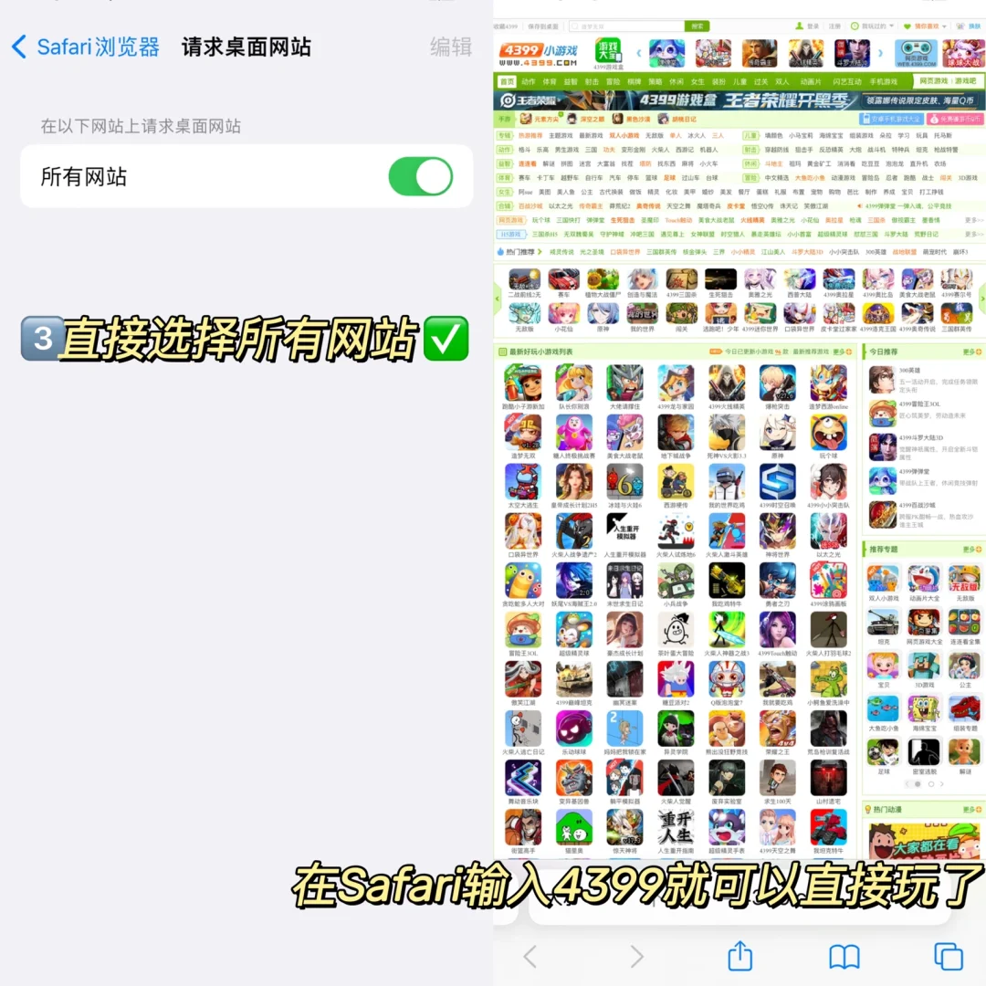 App名:《Safari游览器》 平台: IOS 简介🎮: - 笑裂了!我用手机在地铁上打开了4399! 成功吸引了隔壁座位小朋友的注意,瞬间成为了地铁焦点! 操作步骤🎨: - 1️⃣点开设置找到Safari游览器 2️⃣下滑找到请求桌面网站 3️⃣直接☑️打开所有网站 4️⃣回到Safari游览器里输入4399 注意事项⚠️: - 只能玩H5的游戏,flash的不行(里面会有提示) 该方法只适合iOS❗️