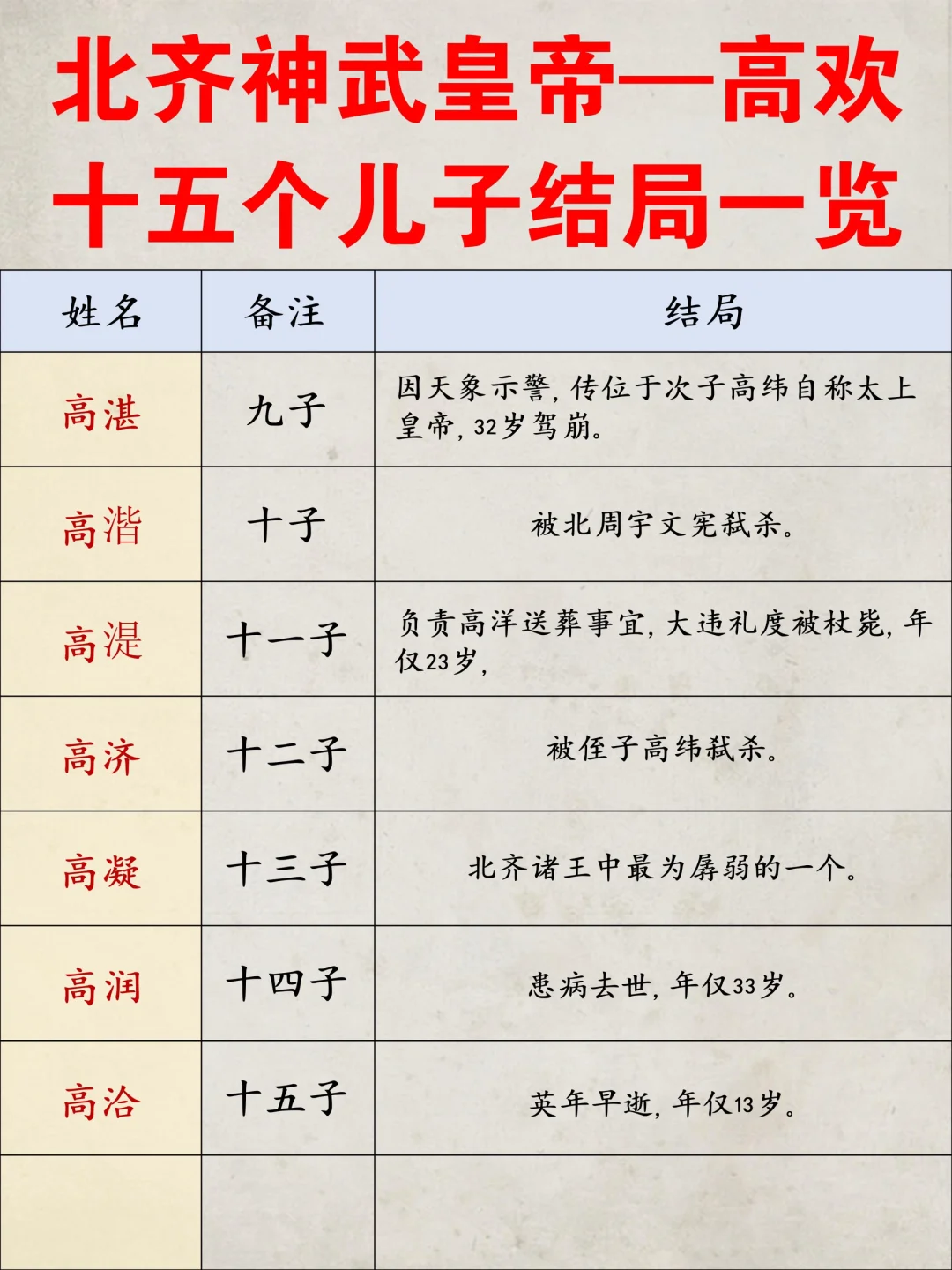 ✅公元 577 年,北齐覆灭,任城王高湝沦为北周的阶下囚。北周齐王宇文宪质问他,国家已然破败灭亡,为何还要顽强抵抗? 👉高湝神色悲愤,回应道:“我是神武皇帝(高欢)之子,兄弟十五人,如今仅我一人尚存。我有何理由不为社稷拼尽最后一丝力气!” 👉后来,高湝被北周赐死。他的兄弟十五人竟无一人有好的结局,更让人讶异的是,北齐神武帝高欢的所有子孙,竟没有一个能活过 40 岁。❓这其中究竟是何缘由呢?