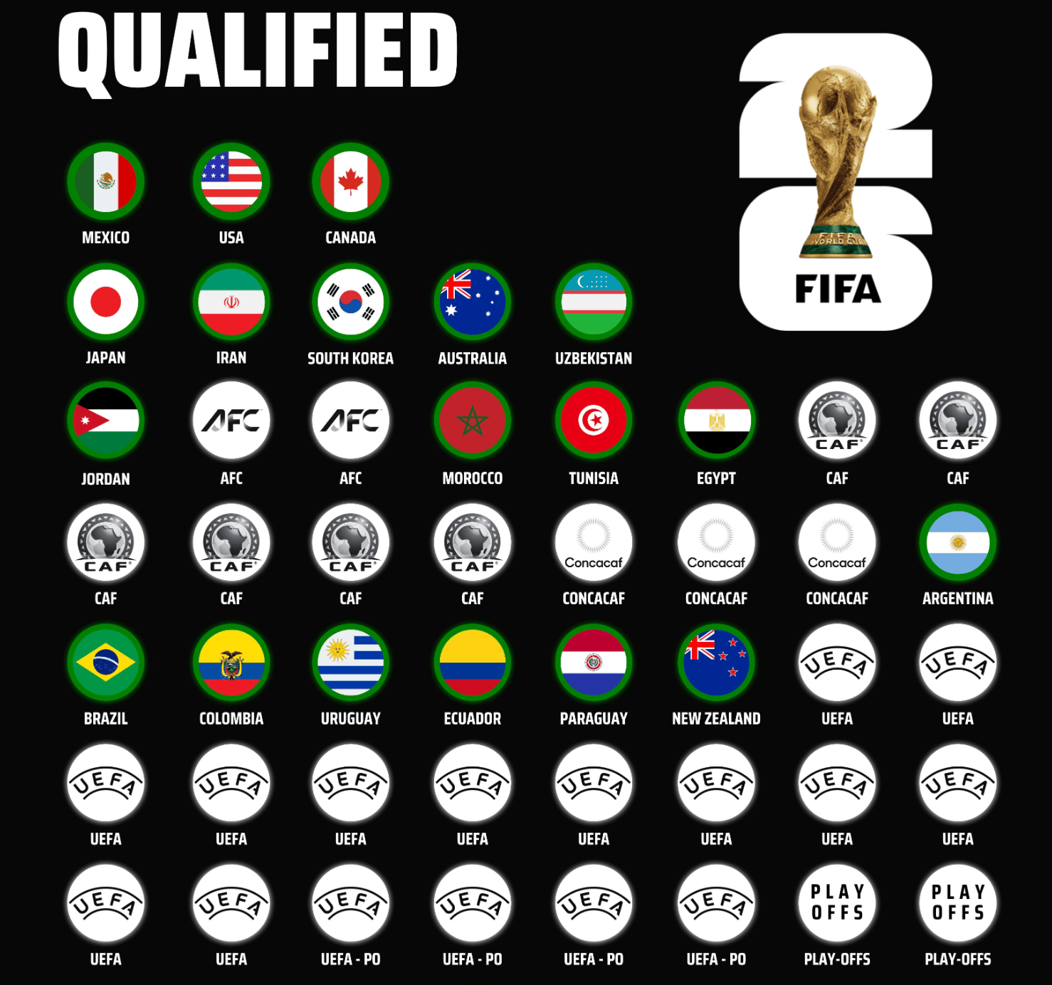 截至目前,已确认晋级2026世界杯的球队有19支:美国、墨西哥、加拿大、日本、新西兰、伊朗、韩国、澳大利亚、乌兹别克斯坦、约旦、阿根廷、巴西、乌拉圭、厄瓜多尔、巴拉圭、哥伦比亚、摩洛哥、突尼斯以及埃及。
