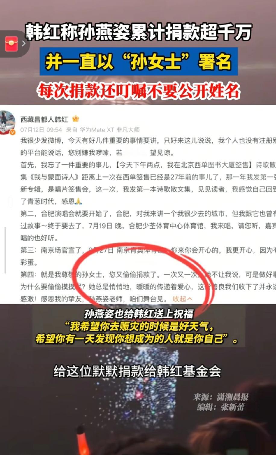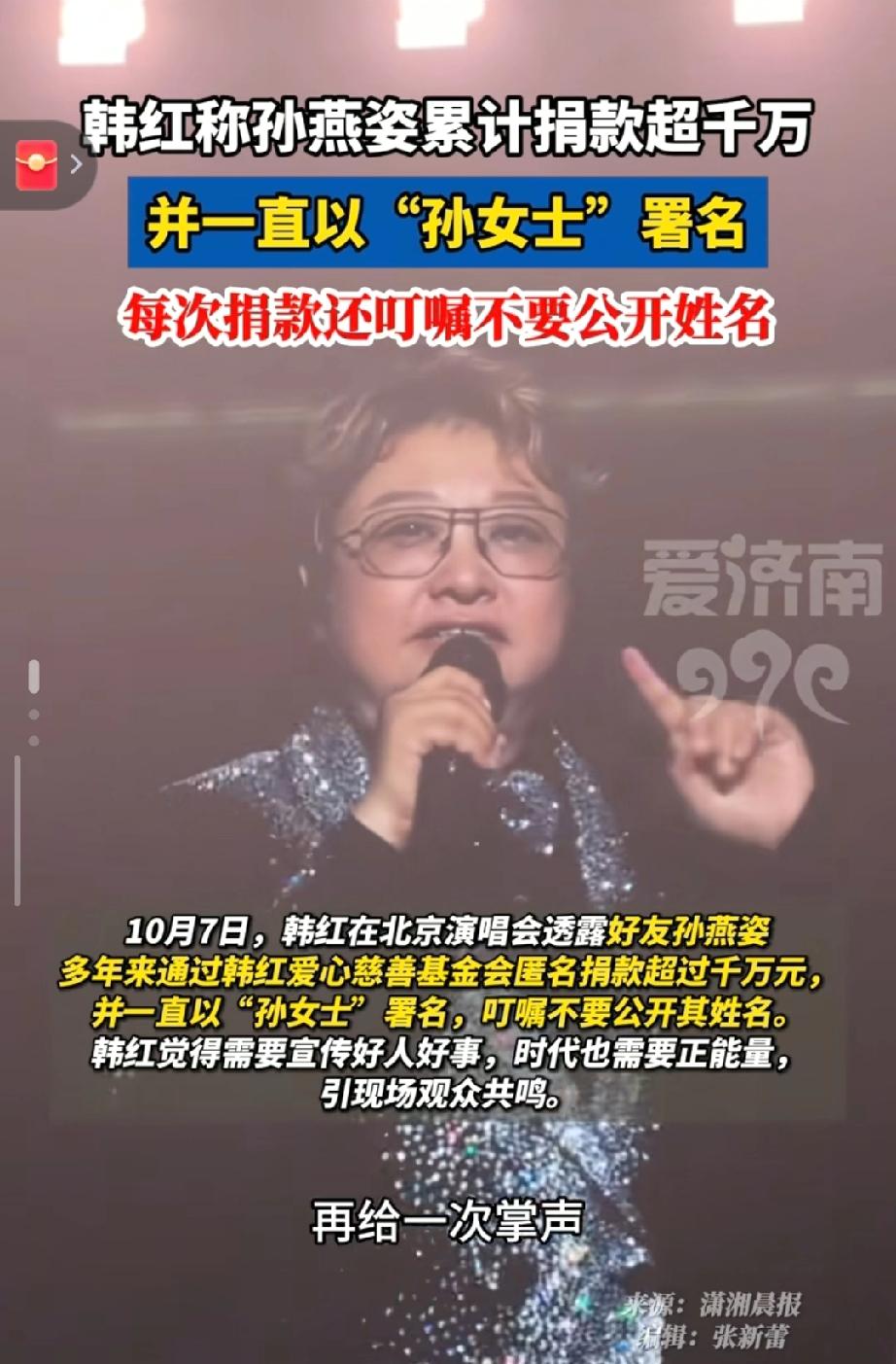 孙燕姿捐了1000万?本人回应:没有千万!韩红演唱会一句话揭开秘密:她用“孙女士”名义多年匿名捐款,总额超千万。更暖心的是,她每次叮嘱“别说是我”。带病凌晨输液,第二天仍准时飞北京支持韩红,只为兑现承诺。真正的天后,不在热搜,而在无声处发光。低调做善事,才是顶级人品。孙燕姿 如何看待孙燕姿低调捐款