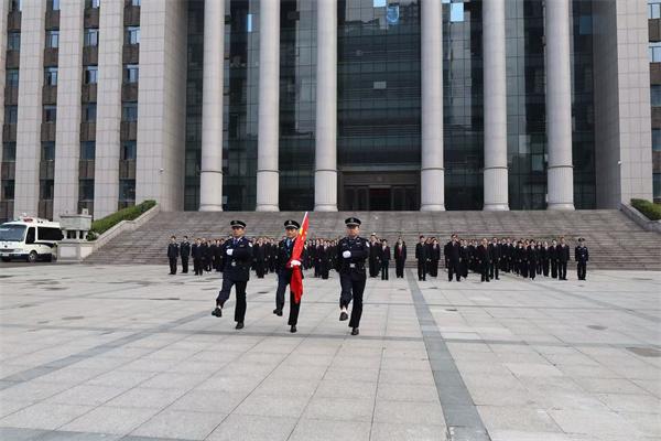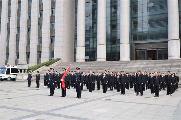 上午8点30分,全体干警身着制服、胸配法徽,整齐列队于南门广场。伴随着激昂的口令,法警们迈着铿锵有力的步伐护卫国旗入场,在雄壮的《义勇军进行曲》中,全体干警面向冉冉升起的国旗行注目礼,以饱满的热情和昂扬的姿态向伟大祖国致敬。