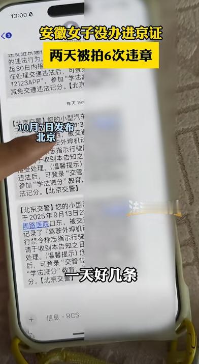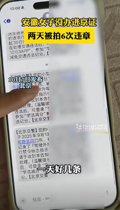 “被气笑了!”10月7日安徽一女子在放假前开车去北京,可两天时间下来,竟然收到了6条违章信息,她自己也不理解,为什么走哪都被拍,后来一打听才知道,是因为自己没办进京证。网友:她要不说我也不知道。[作揖] 安徽的杨女士趁着假期开车去北京探亲,特意选在节前出发,想避开人流高峰,两天下来她开车格外小心,全程遵守交通规则,没想到手机上还是陆续收到了6条违章通知。 这6条违章信息显示,时间分别是10月5日上午10点、下午2点、晚上6点,以及10月6日的上午10点、下午2点和晚上6点,每条违章扣1分罚款100元累计扣了6分罚了600元。 杨女士仔细回想这两天的行车过程,确定自己没有闯红灯,也没有违规停车或者超速,她以为是系统出错了,就打电话咨询了北京交管部门。 工作人员告诉她,这些违章记录都是真实有效的,原因是她的车辆进入北京六环内行驶,但没有办理进京通行证,这种情况下系统每隔4小时就会自动记录一次违章。 杨女士这才知道,外地车辆进入北京六环路以内道路行驶,必须提前办理进京证,她之前只听说过北京限号,完全不知道还有这个要求。 这事儿引发了网友们对外地行车规范和信息提醒的广泛讨论。 “好家伙两天六条违章,这哪是去旅游,这是去给交管部门疯狂上分啊。” “第一次知道进京还要证长见识了,感谢这位姐妹用600块和6分给我上了一课。” “导航软件真的该背点锅,快到限行区域或者需要办证的地方,弹个提醒很难吗,技术这么发达了都。” “说实话去外地之前确实该做做功课,但有些规矩真的藏得太深了,防不胜防啊。” “每4小时拍一次这规则也太狠了,这不就是专门盯着外地车薅羊毛吗。” “心疼但有点想笑,这经历也太惨了,估计她以后再也不敢不开导航不去查交规了。” “北京交规确实严,但没想到这么严,看来下次去还是老老实实坐高铁吧省心。” “感觉很多大城市都有这种隐藏关卡,一不小心就中招,纯纯大冤种了。” “说白了就是信息差,本地人觉得是常识,外地人完全不知道,相关部门提示不到位。” “罚款不是目的,目的是让大家遵守规则,但首先得让人知道规则是啥吧。” 你开车去外地旅游时遇到过类似的问题吗?对于这类通行管理规定有什么看法或建议?欢迎在评论区分享你的经历。 信息来源 :法治进行时 2025-10-07