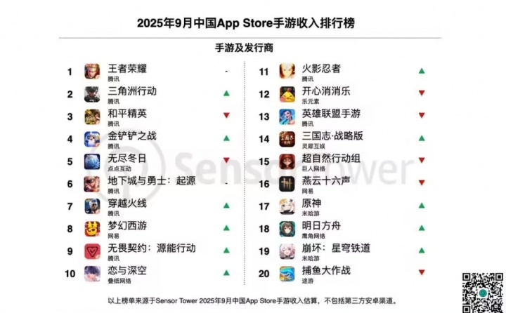 SensorTower还公布了同期中国AppStore手游收入TOP20。据了解,腾讯《王者荣耀》《三角洲行动》《和平精英》和《金铲铲之战》包揽本期中国AppStore手游收入榜TOP4。详见下图: