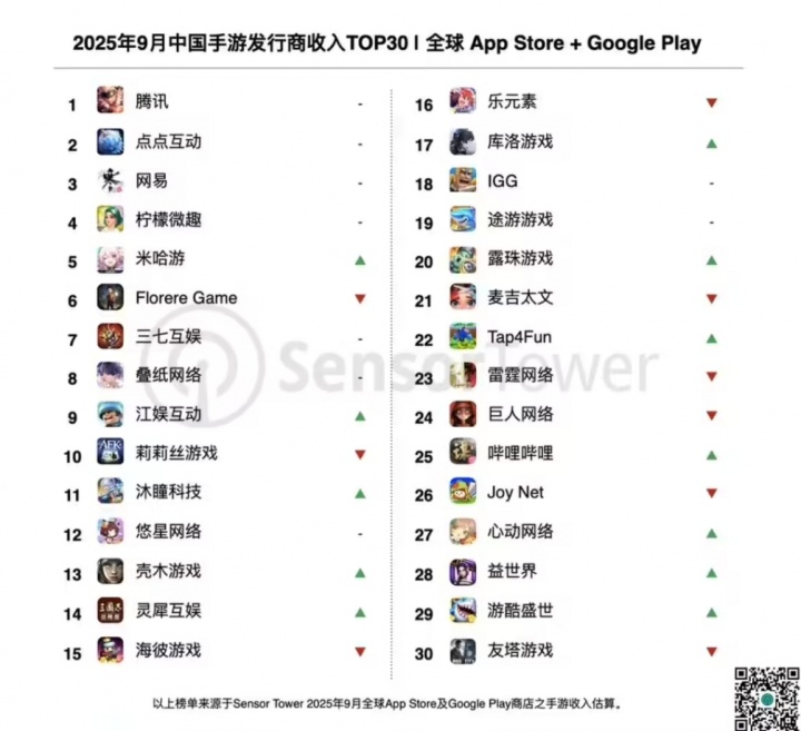 直播吧10月09日讯SensorTower商店情报平台今天公布了《2025年9月中国手游发行商全球收入排行榜》,IT之家从数据中获悉,当月共32个中国厂商入围全球手游发行商收入榜TOP100,合计吸金19.5亿美元,占同期全球TOP100手游发行商收入36.1%。