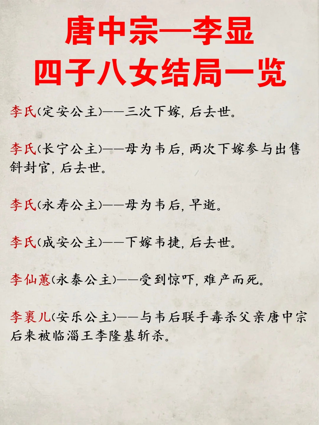 长子李重福,兵败投河; 次子李重润,武后杖杀; 三子李重俊,兵败被斩; 📖李显—唐高宗李治与武则天之子,作为大唐第四位皇帝,他始终笼罩在母亲武则天的强大光环之下,一生可谓坎坷波折。 👉李显曾两度登上皇位主政,然而最终却落得个被自己的妻子和女儿毒死的悲惨结局,实在令人唏嘘不已。