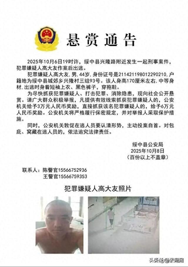 10月8日,辽宁葫芦岛绥中县公安局发布悬赏通告称,将抓获嫌疑人高大友悬赏金额提升至6万元。