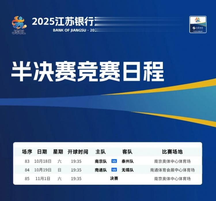 直播吧10月9日讯“苏超”官方公布半决赛赛程,两场半决赛10月18日和19日进行。