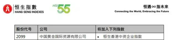 另外,中国黄金国际(02099.HK)将加入恒生香港中资企业指数。有关变动将于本月27日生效。