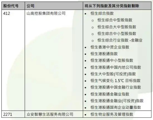 恒生指数公司公布,由于山高控股(00412.HK)、众安智慧生活(02271.HK)在证监会的股权高度集中名单上,故不再符合纳入恒生指数系列的标准。