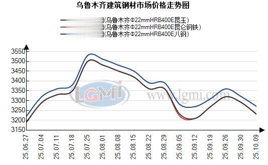 根据兰格钢铁云商平台监测数据显示,以乌鲁木齐为例,截至2025年10月8日,乌鲁木齐建材市场HRB400EΦ22mm螺纹钢八钢3270元,昆仑钢铁3230元,昆玉3230元,闽新3230元,大安3180元,新安特3220元,和钢3190元,较上个交易日下跌50-60元;HPB300Φ8-10mm高线八钢3420元,较上个交易日下跌50元;HRB400EΦ8-10mm三级盘螺八钢3470元,较上个交易日下跌50元。