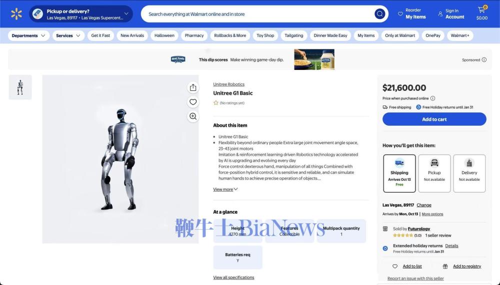 10月9日消息,中国人形机器人企业宇树科技——其G1人形机器人已正式上架沃尔玛美国官网,基本款售价21600美元(约合15.4万元人民币),支持免费送货且单次可订购六台,而该型号在中国的售价为9.9万元人民币。